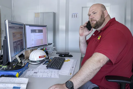 Auch die Koordination der Materialströme vom Werktor zu den Baustellen gehört zum Leistungsspektrum. Kontraktoren registrieren sich für das Online Logistics Control Center, kurz OLCC, von Zeppelin Rental, buchen für ihre Transporte ein Zeitfenster und wählen eine Entladezone aus. „Wir prüfen hier auch die Plausibilität“, erklärt Projektleiter Christoph Hardt. „Es werden Pflichtangaben wie beispielsweise Kennzeichen und Fahrername abgefragt sowie Angaben zur Entladezone, zu Ladezeit, Ankunftszeit sowie zum zu liefernden Material überprüft.“ Insgesamt 95 solcher Zonen hat das Team im Chemiepark eingerichtet. Um dennoch auch spontane Transporte zu ermöglichen, steht vor einem der Werkseingänge, an Tor 6, ein Container von Zeppelin Rental bereit. Zwei Mitarbeiter führen dort für „Kurzentschlossene“ eine Expressanmeldung durch. Allerdings: Dieses Vorgehen sollte die Ausnahme sein. Insgesamt wurden im Projektverlauf 45.000 Transporte avisiert, 600 davon Schwer- und Sondertransporte.