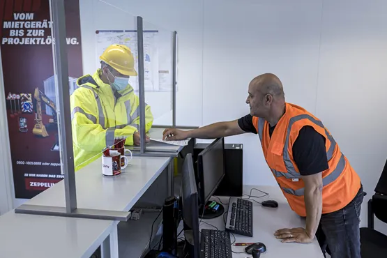 In einem ersten Schritt erstellten respektive überarbeiteten Zeppelin Rental und Evonik als Basiswerk ein Baulogistikhandbuch, in dem alle aufgrund der Baumaßnahmen erforderlichen Prozesse genau beschrieben sind. Auf diese Weise wurde ein Standard definiert, an welchem sich alle Projekte orientieren müssen. Dies beginnt schon beim Baustellenzutritt, der an den bestehenden Anmeldeprozess des Chemieparks anknüpft, beziehungsweise diesem vorgeschaltet ist. „Firmen, die im Rahmen der verschiedenen Bauprojekte vor Ort tätig sind, melden sich und ihre Mitarbeitenden über unser digitales System InSite an“, erklärt Projektmanager Mathias Gülker. „Wir fordern obligatorische Dokumente wie beispielsweise die Mindestlohnerklärung und je nach Herkunft eine A1-Bescheinigung oder eine Arbeitserlaubnis an und übernehmen die Legitimation.“ Erst, wenn alle nötigen Dokumente vorliegen und überprüft sind, kann über den Werksschutz von Evonik ein individueller Werkausweis ausgestellt werden. „Insgesamt haben wir bisher 10.000 Mitarbeitende für den Werkszutritt legitimiert“, so Gülker.