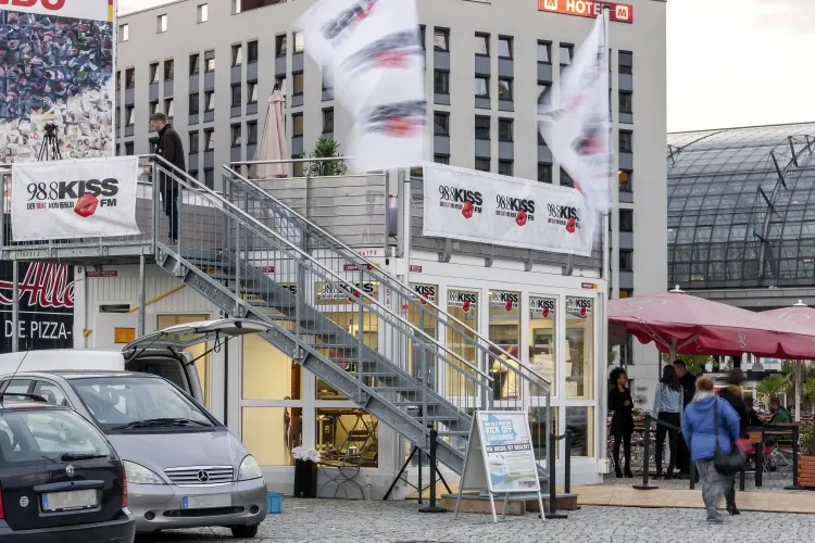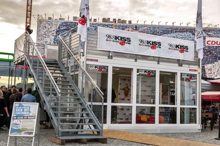 Und so ging es an die Umsetzung des Projekts. In der eigenen Fertigungshalle in Berlin-Hohenschönhausen wurde ein Wechselwandcontainer mit einer Front und zwei Seiten aus Glas inklusive Fensterelementen versehen sowie der Dusch-/WC-Container vorbereitet. Im Anschluss folgte der Transport zum Washingtonplatz am Berliner Hauptbahnhof, wo die KISS-FM-Aktion stattfinden sollte. Dort stellten die Monteure von Zeppelin Rental die Raummodule und setzten die Dachterrasse samt 16-stufiger Außentreppe auf.