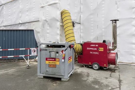 Zeppelin Rental transportierte die Heiztechnik an und baute sie fachgerecht auf. So muss die durch die Heizer erzeugte warme Luft über die Warmluftschläuche auf möglichst kurzen Wegen an die zu beheizenden Stellen geführt werden. Zudem gibt es unter anderem sicherheitstechnische Vorgaben bezüglich der einzuhaltenden Abstände der Heizgeräte von brennbaren und nicht brennbaren Materialien. Die Mietstation Bayreuth montierte auf Kundenwunsch zusätzlich an jeden Sicherheits-Öltank einen Feuerlöscher und versah die Ölschlauchleitung vom Tank zum Heizgerät mit einer zusätzlichen Dämmung, um einem Paraffinieren des Heizöls vorzubeugen.