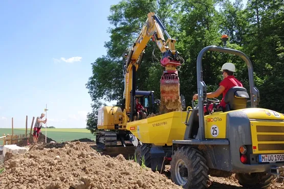 Für die Erdarbeiten mit einem Volumen von zirka 600 Kubikmetern, den Einbau der Schottertragschichten und Spielgeräte sowie für das Setzen der Natursteine griff Gärtnermeister Thomas Zink auf den Kurzheck-Minibagger CAT 308 E CR zurück. Mit einem Einsatzgewicht von neun Tonnen, einer Reichweite von 7,6 Metern und seiner kompakten Bauweise eignete sich dieser ideal für die zu erledigenden Aufgaben. Des Weiteren kamen ein Raddumper 3001 DK und ein Radlader CAT 906 M für den Materialtransport sowie handgeführte Verdichtungstechnik von Zeppelin Rental zum Einsatz.