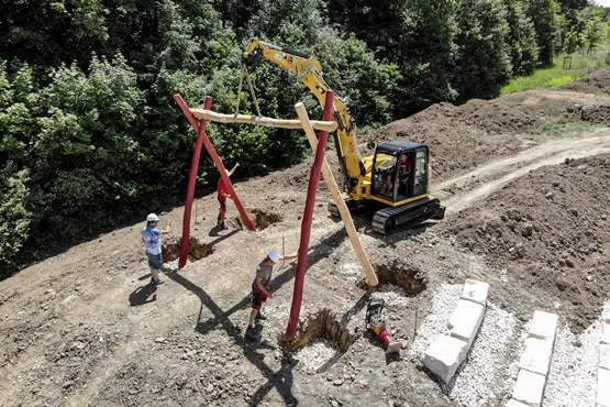 Darunter befindet sich eine zehn Zentimeter dicke, wasserdurchlässige Sauberkeitsschicht aus Einkornbeton, die den einfachen Austausch des Bodenmaterials in der Zukunft ermöglicht. Neben dem stoßdämpfenden Boden gehört die Freiheit von Hindernissen zu den zu beachtenden Anforderungen im Fallraum der Spielgeräte. Beim Bau der Trockenmauern aus Kalksteinquadern mithilfe des Kurzheck-Minibaggers CAT 308 E CR beispielsweise musste vom Ende der Rutsche bis zum ersten Stein ein Abstand im Radius von 2,5 Metern eingehalten werden.