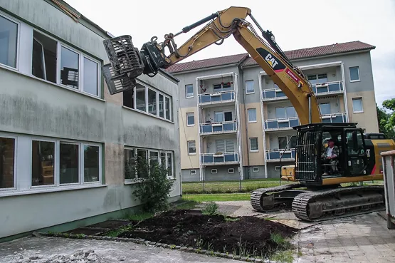Ein Projekt der eher kurzen Wege stellte da der Abbruch einer Kindertagesstätte in Parchim dar. Nur rund 30 Kilometer liegt die Kreisstadt vom Firmensitz in Grabow entfernt. Bei der Baumaßnahme konnte das Team alle vorhandenen Kompetenzen einbringen – angefangen von der Schadstoffsanierung über den Rückbau bis hin zum Erdbau. In einem ersten Schritt wurden 55 Tonnen asbestbelastete Dachpappe des Gebäudes entfernt, sicher verpackt und entsorgt. Im Anschluss ging es an den Rückbau von insgesamt 15.000 Kubikmetern umbautem Raum. 5.000 Tonnen Stahlbeton fielen dabei an, die abgefahren und recycelt wurden. Während die Entkernung von Hand erfolgte, kamen für den Abbruch ein Kettenbagger Cat 320 der nächsten Generation sowie ein Kettenbagger Cat 320 F mit Abbruchsortiergreifer, Betonschere, Stemmhammer und Sortierlöffel von Zeppelin Rental zum Einsatz.
