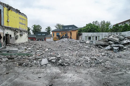 Die eher engen Platzverhältnisse machten auch eine genaue Vorabplanung der Logistik erforderlich. „Wir mussten uns genau überlegen, wie und wo wir mit dem Rückbau starten, um Raum für die Container und die Vorsortierung zu schaffen sowie den An- und Abtransport zu ermöglichen“, erklärt der Geschäftsführer. Insgesamt wurden fünf Container à 30 Kubikmeter Baumischabfall und 20 Kubikmeter Holz zur rund 15 Kilometer entfernten Deponie gefahren. Zum Leistungsspektrum von Demontage und Management gehörte zudem der Rückbau von 3.000 Quadratmetern Befestigungsflächen sowie die Verfüllung des drei Meter tiefen Kellers mit 7.000 Kubikmetern Boden.