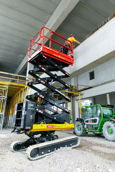 Bei Personenarbeitsbühnen sind Elektromotoren für die Arbeiten in Innenräumen bereits Standard. Der Anteil von Hybrid- und Akkutechnik in der Flotte von Zeppelin Rental liegt bei Staplern und Arbeitsbühnen inzwischen bei über 80 Prozent, Tendenz steigend. Neu dabei: Die hybride Scherenarbeitsbühne BIBI 1090-BL EVO BIENERGY, die über einen Dieselmotor sowie einen Lithium-Ionen-Akku verfügt. Je nach Projektanforderung können Kunden flexibel entscheiden, wann sie emissionsfrei arbeiten möchten. Weitere Vorteile sind das robuste Raupenfahrwerk und das automatische Nivellierungssystem.