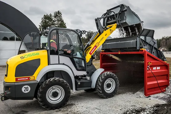 Der 5055e zeichnet sich neben dem reinen Elektroantrieb durch eine konstante Nutzlast, hohe Standsicherheit, Allradlenkung und dadurch einen minimalen Wendekreis aus. Dabei steht die Maschine in Sachen Leistungsdaten einem dieselbetriebenen Radlader derselben Klasse in nichts nach. So können Steinpaletten und Big-Bags mit dem E-Radlader genauso transportiert und umgeschlagen werden wie unterschiedliche Schüttgüter. Selbstverständlich ist die Maschine auch mit einer hydraulischen Schnellwechseleinrichtung für den einfachen Anbaugerätewechsel ausgestattet.