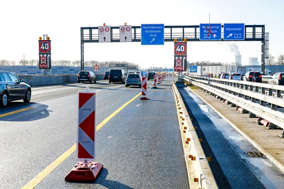 Diese Sensoren vermessen die Fahrzeuge und erstellen ein digitales Abbild. Wird dieses anschließend detektiert, schaltet eine Ampel über der Fahrspur auf Rot. Eine Schranke schließt sich vor dem zu schweren Fahrzeug und es wird auf eine Ausweichfläche geführt. Für das Fahrzeugdifferenzierungssystem und die dazugehörige Verkehrssicherung auf der A43 montierte das Team der Baustellen- und Verkehrssicherung von Zeppelin Rental 2500 Meter temporäre Schutzeinrichtungen, verlegte 6000 Meter Energie- und Datenkabel und installierte 40 verschiedene Elemente wie ANPR-Kameras, Überwachungskameras und Scanner.