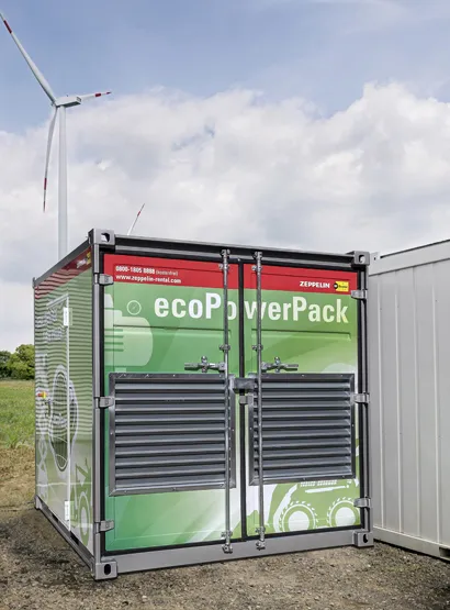 Zeppelin Rental zeigt mit dem ecoPowerPack eine vom Unternehmen mitentwickelte ökonomische und ökologische Baustellen-Energiezentrale zur Miete. In einem eigens konzipierten 10 Fuß Technikcontainer befinden sich ein Stromaggregat sowie ein Stromspeicher. In Kombination sorgen die beiden Geräte für eine kraftstoffsparende, effiziente und umweltfreundliche Energieversorgung. Der Stromspeicher gibt den vom Aggregat erzeugten Strom nach Bedarf in der benötigten Menge an den Verbraucher ab. Zusätzlich steuert seine Elektronik den Stromerzeuger, so dass dieser nur dann läuft, wenn die Energie im Speicher für die Versorgung des Verbrauchers nicht ausreicht. Auf diese Weise können Kraftstoff eingespart und Schadstoffemissionen verringert werden. Kunden profitieren zudem von einer vorkonfigurierten Energiezentrale, die vor Wind, Wetter, Diebstahl und Vandalismus geschützt ist.