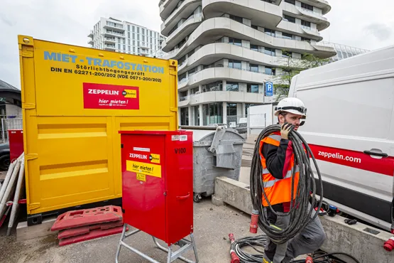 „Momentan sind elf Baustromverteiler im Einsatz, die auch bereits den mit dem Rohbau beschäftigten Gewerken Strom liefern“, erzählt Viktor Airich. Versorgt werden die Gruppen-, End- und Einzelverteiler über eine von Zeppelin Rental montierte Trafostation. Sie transformiert die eingehende Spannung, eine 10.000-Volt-Zuleitung, auf 400 Volt und speist sie anschließend in die Baustromverteilerschränke ein. Auf Basis der Leistungsaufnahme der Verbraucher berechnete Zeppelin Rental zudem die nötigen Kabelquerschnitte und -längen. 180 Meter haben die Monteure bisher verlegt, demnächst kommen weitere 650 Meter hinzu. Ein Meter Kabel wiegt rund acht Kilogramm. Auch die Zahl der Baustromverteiler wird noch um ein Vielfaches steigen.