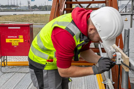 Eine Besonderheit bei der Montage der Elektro-Baustelleneinrichtung stellt die Lage des neuen Quartiers dar. Da es sich über eine Landzunge, quasi eine Halbinsel in der Norderelbe, erstreckt, besteht beispielsweise bei einer Sturmflut die Gefahr der Überschwemmung. Aus diesem Grund montierte Zeppelin Rental die Kranverteilerschränke in zehn Metern Höhe im Turm der Kräne und verlegte auch die Kabel entsprechend. Eine Arbeit, die auch die Unterstützung der Kranführer erforderlich machte.
