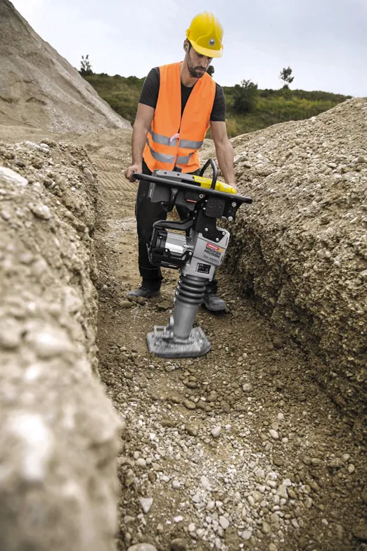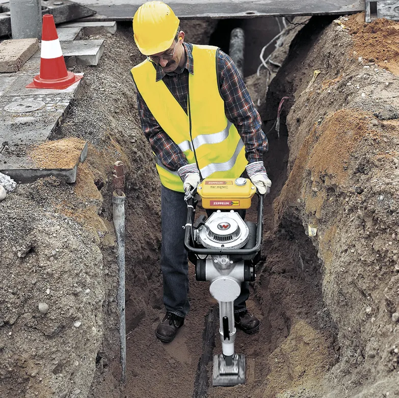 Für umweltsensible Bereiche oder schlecht belüftete Gräben eignet sich der akkubetriebene Rüttelstampfer AS 50e. Er arbeitet völlig emissionsfrei und schützt dadurch den Anwender vor Schadstoffen an besonders tiefgelegenen oder schlecht belüfteten Einsatzorten. Zum Bedienkomfort tragen zusätzlich die niedrigen Hand-Arm-Vibrationen bei sowie ein wartungsarmer Elektromotor, der auf Knopfdruck gestartet wird. Für sehr schmale Gräben oder zum Beistopfen der Rohrzwickel ist bei Zeppelin Rental zudem der AS 30e mit extra schmalem Fuß erhältlich. Diesen Spezialstampfer bietet das Unternehmen auch mit Benzinantrieb an. Er zeichnet sich durch ein minimiertes Gewicht und kompakte Abmessungen aus.